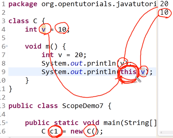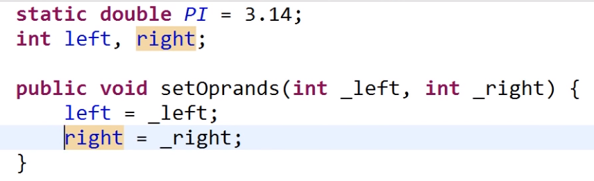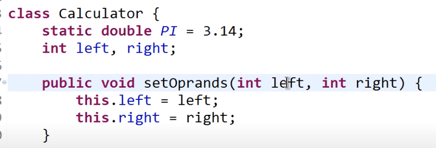 - 원주율인 3.14는 이미 알려져있는 수이다. 따라서 각각의 인스턴스 마다 원주율의 값을 별도로 가지고 있을 필요가 없다. 이런 경우 변수를 클래스의 맴버로 만들면 된다.