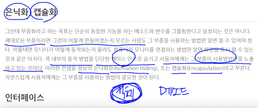 은닉화 : 객체가 어떻게 생겼는지 몰라도 메소드의 사용방법만 알아도 사용 가능하도록 하겠다는 것.