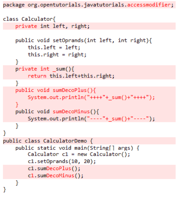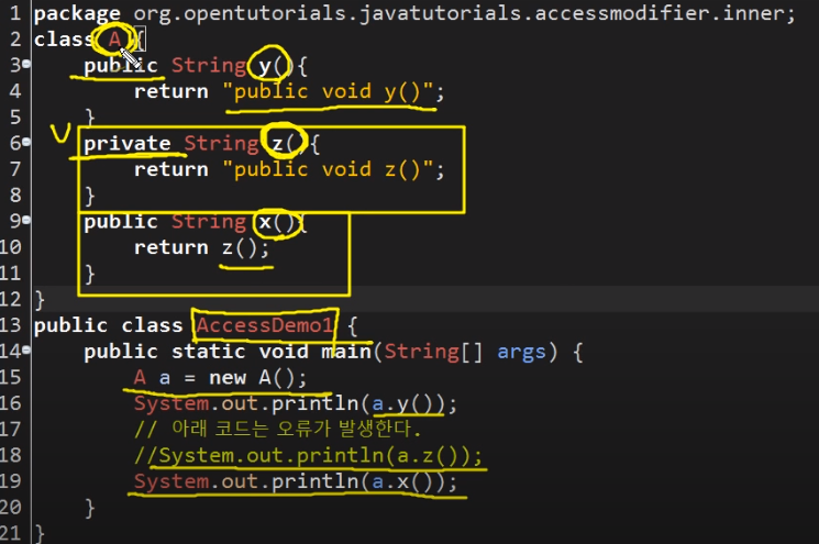 - 메소드가 키워드 private으로 시작되고 있다. private은 클래스(A) 밖에서는 접근 할 수 없다는 의미다.