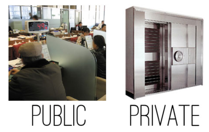 - 이런 문제로부터 객체의 로직을 보호하기 위해서는 맴버에 따라서 외부의 접근을 허용하거나 차단해야 할 필요가 생긴다. 마치 은행이 누구나 접근 할 수 있는 창구와 관계자외에는 출입이 엄격하게 통제되는 금고를 구분하고 있는 이유와 같다.