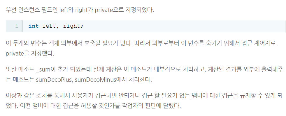 특히 로직이 망가지는 첫번째 용의자는 사용자다. 즉 객체를 사용하는 입장에서 객체 내부적으로 사용하는 변수나 메소드에 접근함으로서 개발자가 의도하지 못한 오동작을 일으키게 되는 것이다.