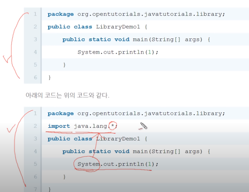 패키지 java.lang은 자바 프로그래밍을 하기 위해서 필수적인 클래스들을 모아둔 패키지다. 따라서 사용자의 편의를 위해서 자동으로 로딩을 하고 있는 것이다.