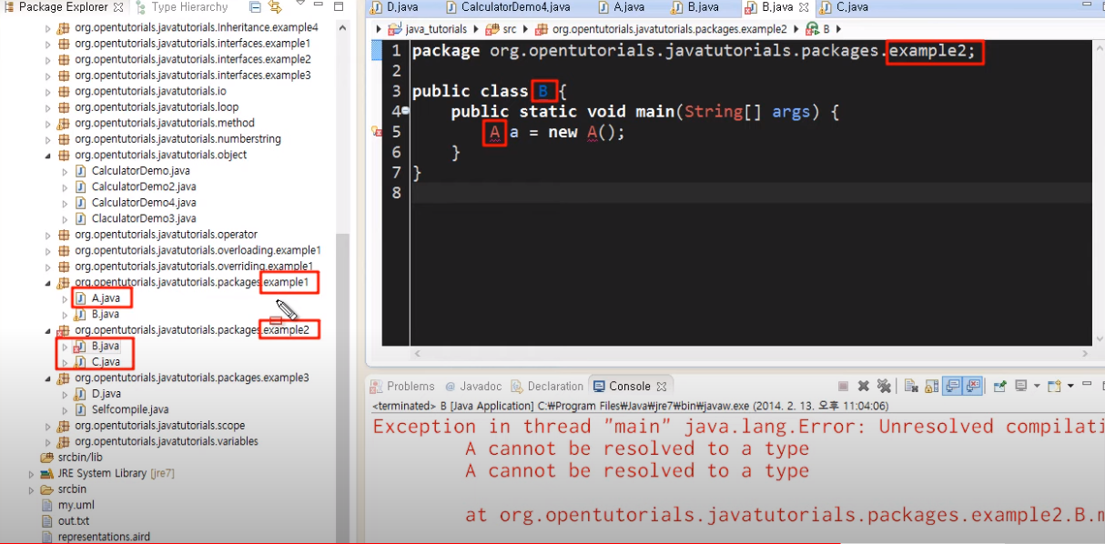 - B클래스가 A를 사용하려고 하지만 example2 패키지 안에는 A파일이 없어서 실행이 안되는 상황.