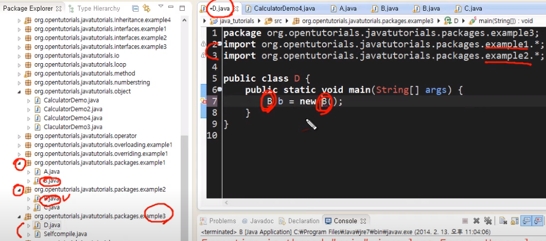 만약 import 한 패키지 안에 같은 이름의 클래스가 존재하고 이 클래스를 사용하고 싶다면 어떤 문제가 발생할까? 아래 코드는 import 하고 있는 두개의 패키지에 클래스 B가 존재하는 경우에 어떤 일이 발생하는가를 보여준다.