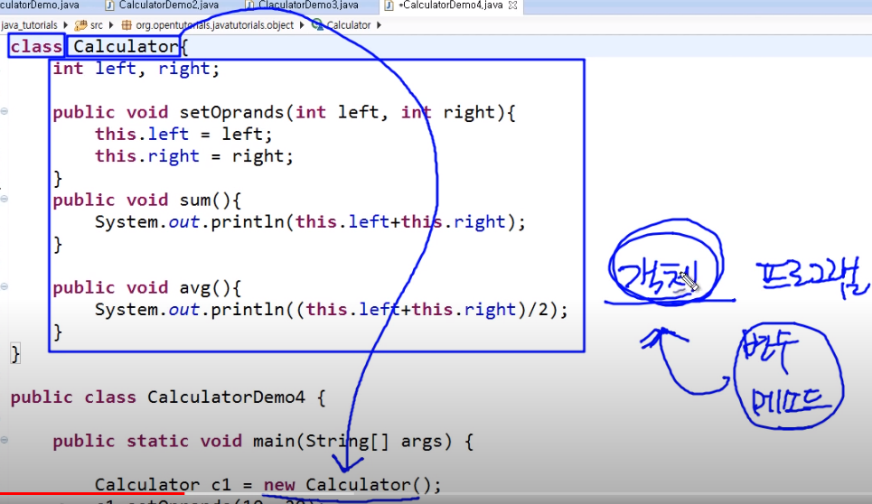 이 로직들을 대표하는 이름을 계산기라는 의미의 Calculator라고 정하고 이것들을 Calculator이라는 이름으로 그룹핑하고 싶다. 이럴 때 사용하는 키워드가 class이다.